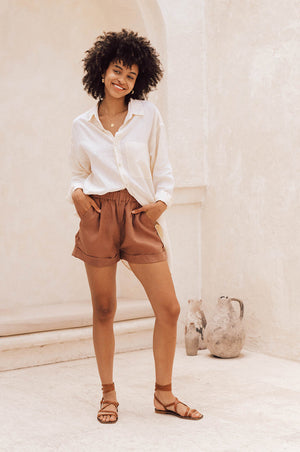 Such an effortless essential for your holidays and beyond! The highly flattering design of our SUMMER shorts and their super soft feel of light-weight, 100% French flax linen make them the perfect addition to your wear-forever summer wardrobe. They feature an elasticated waistband for extra comfort and side pockets with beige lining to reduce transparency. Style them with our SUMMER linen shirt-dresses for an instant sophisticated sunshine outfit you will live in all summer long.