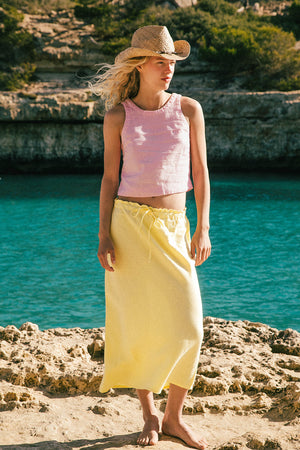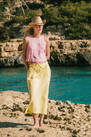 Crafted from breezy 100% premium French Flax linen, the SANTANYI skirt adds a fresh Mediterranean feel to any summer look. Pair it with simple tanks like our light rose PALMA Top or throw on an oversized shirt like our linen SUMMER shirt-dress. The soft lemon sorbet colour feels like a sun-kissed vintage hue that works beautifully with both bright and neutral tones.