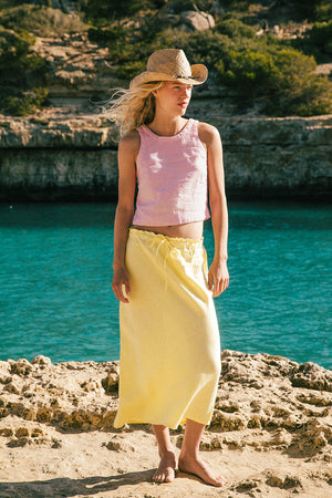Pair it with our SANTANYI bias skirt in lemon sorbet for a pop of vacation style, or keep it laid-back with relaxed denim. Whether you are catching sunsets or exploring new spots, this breezy linen top adds a touch of effortless chic to any summer outfit.