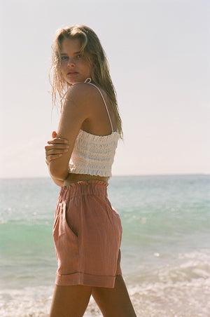 Such an effortless essential for your holidays and beyond! The highly flattering design of our SUMMER shorts and their super soft feel of light-weight, 100% French flax linen make them the perfect addition to your wear-forever summer wardrobe. They feature an elasticated waistband for extra comfort and side pockets with beige lining to reduce transparency. Style them with our SUMMER linen shirt-dresses for an instant sophisticated sunshine outfit you will live in all summer long.