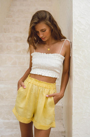 Such an effortless essential for your holidays and beyond! The highly flattering design of our SUMMER shorts and their super soft feel of light-weight, 100% French flax linen make them the perfect addition to your wear-forever summer wardrobe. They feature an elasticated waistband for extra comfort and side pockets with beige lining to reduce transparency. Style them with our SUMMER linen shirt-dresses for an instant sophisticated sunshine outfit you will live in all summer long.
