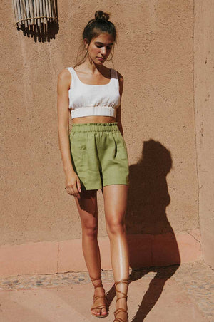 Our elevated version of a sporty crop top. We like to call it 'sophisty-comfy'! It is crafted from super soft, 100% textured cotton with full lining and features an elasticated waistband for extra comfort. You can wear the top both front and back for either a soft curved or a V-neckline. Looks especially stunning with minimal golden jewellery on bare skin! Combine the MOMENT Top with our SUMMER linen shorts or EASE hemp pants for effortless sophistication.